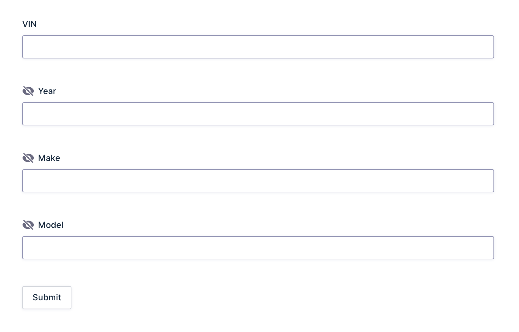 We’ve hidden the Year, Make, and Model fields because they don’t need to be seen, as they’ll only be filled in once the form is submitted.