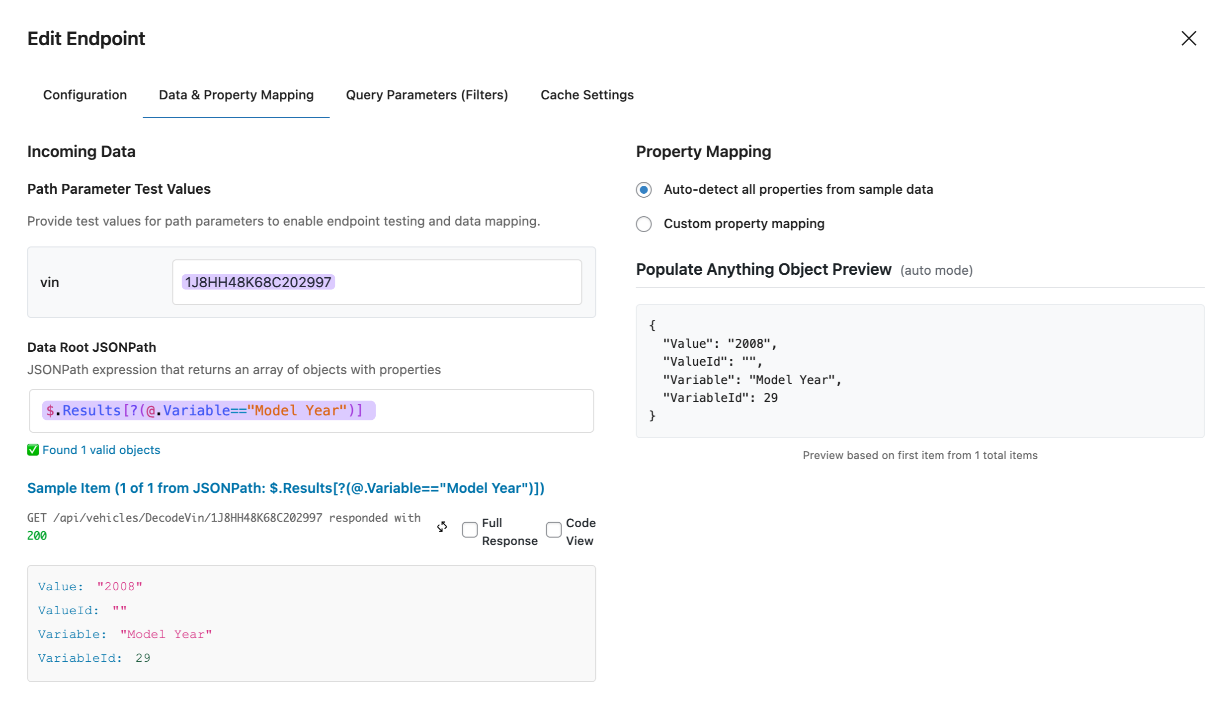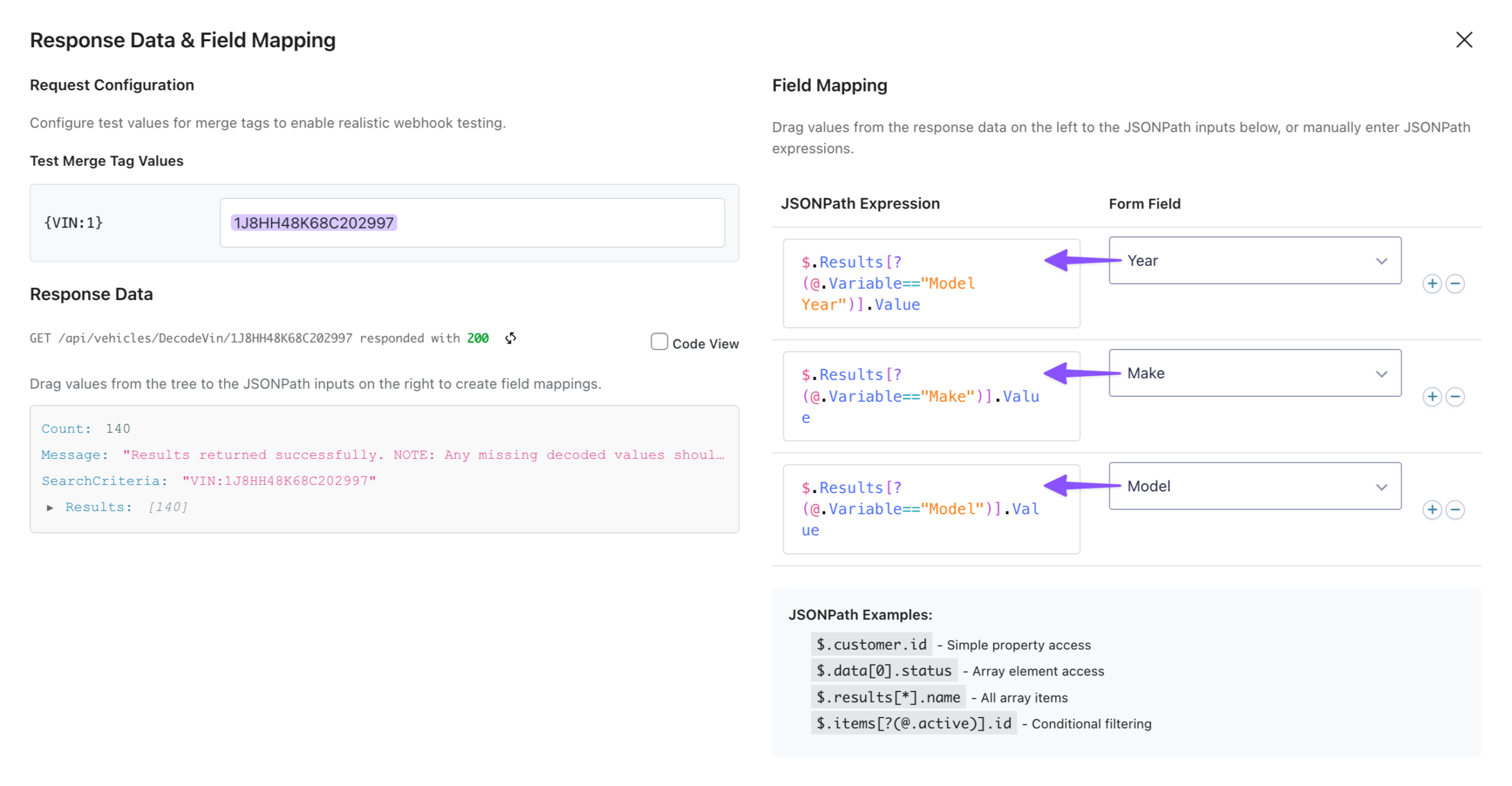 To grab just the year, make, and model, we’ll use a JSONPath. Think of it as a filter that picks out exactly what you’re looking for.