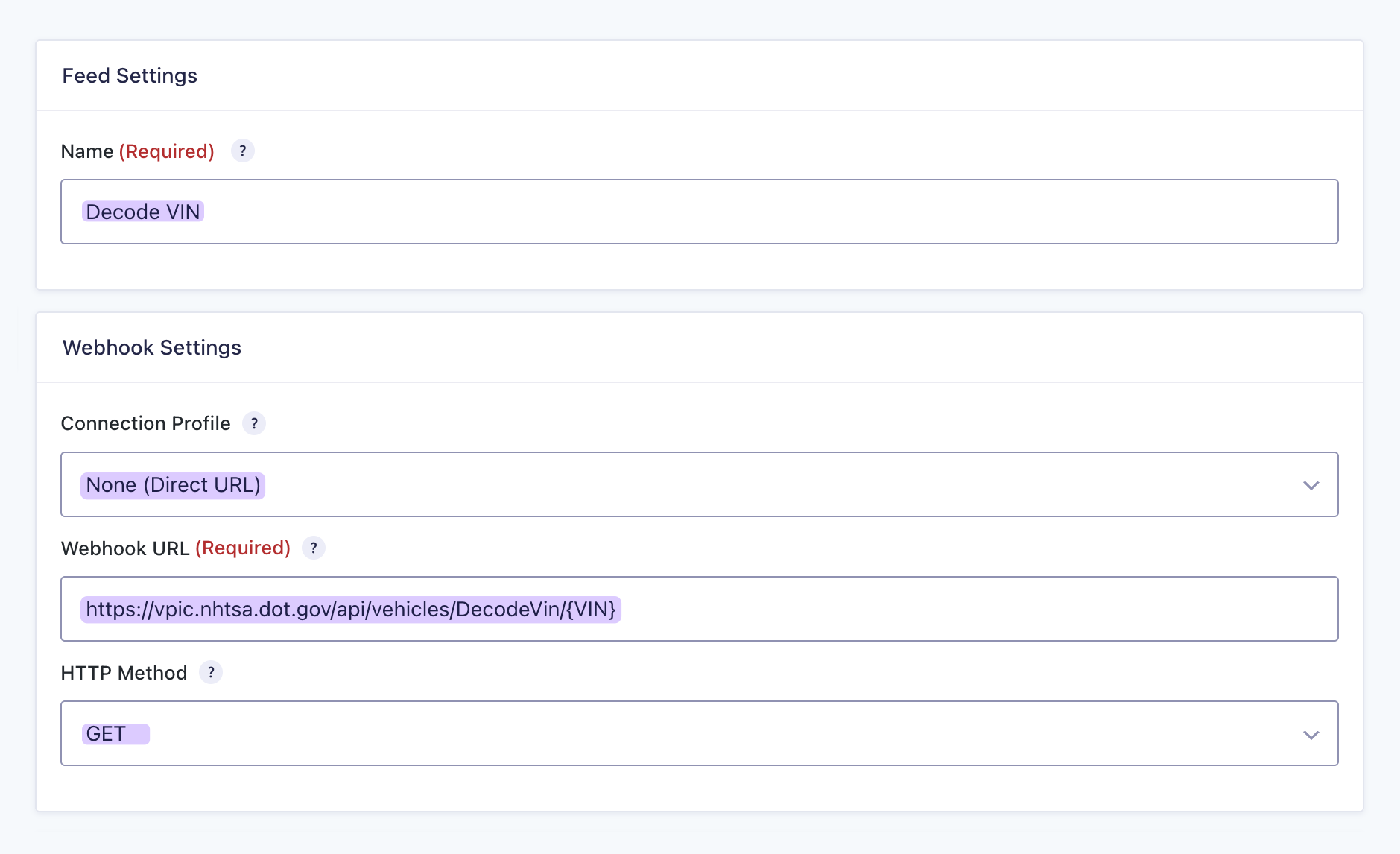 Think of a feed as the instructions. When someone submits a form, the feed says: “Hey, take this VIN, send it to NHTSA, and bring back the vehicle data for me.”