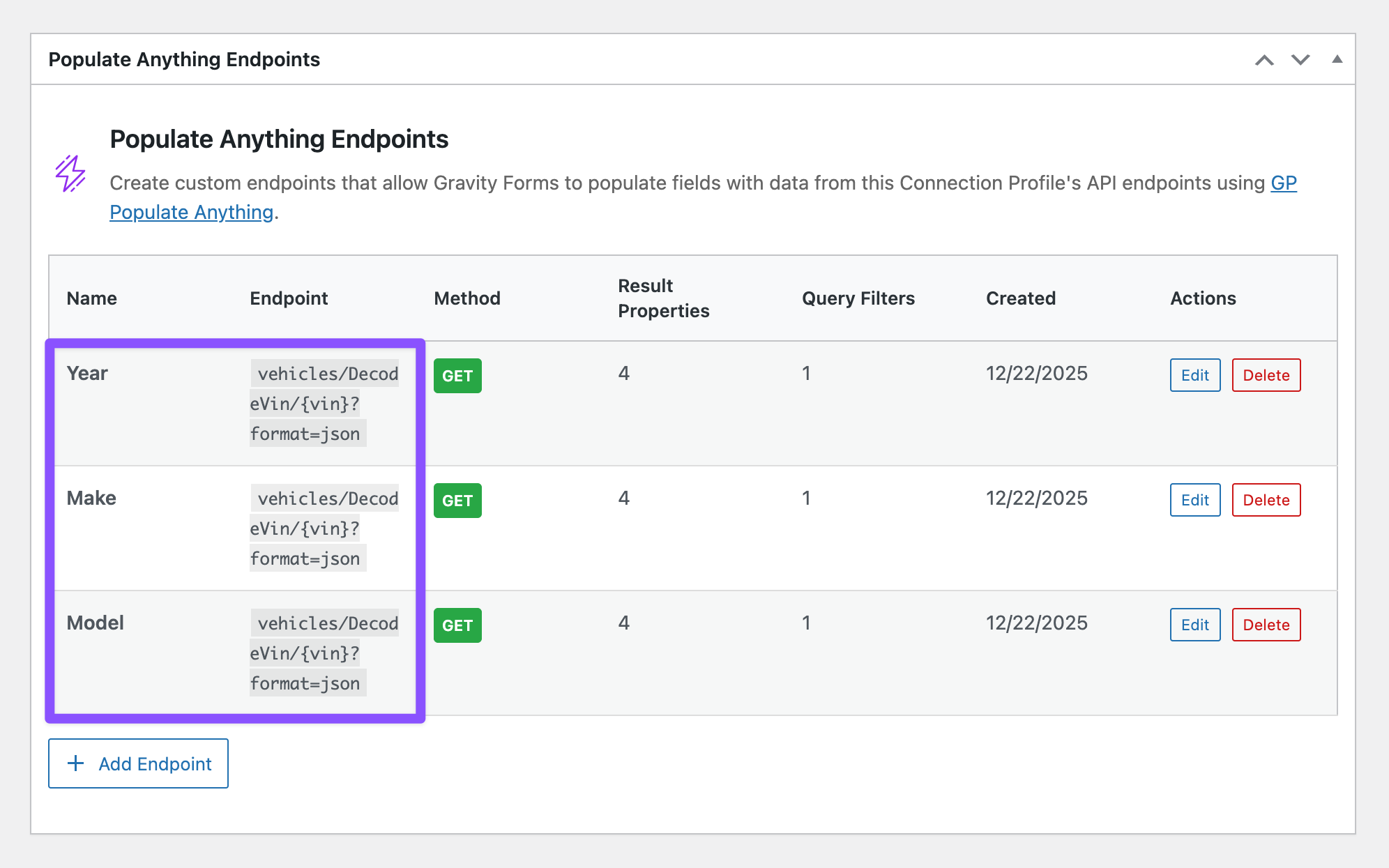 Let’s head back to the VIN Decoder connection profile we created earlier and set up the live lookup endpoints. These will let each field in our form pull data in real-time.