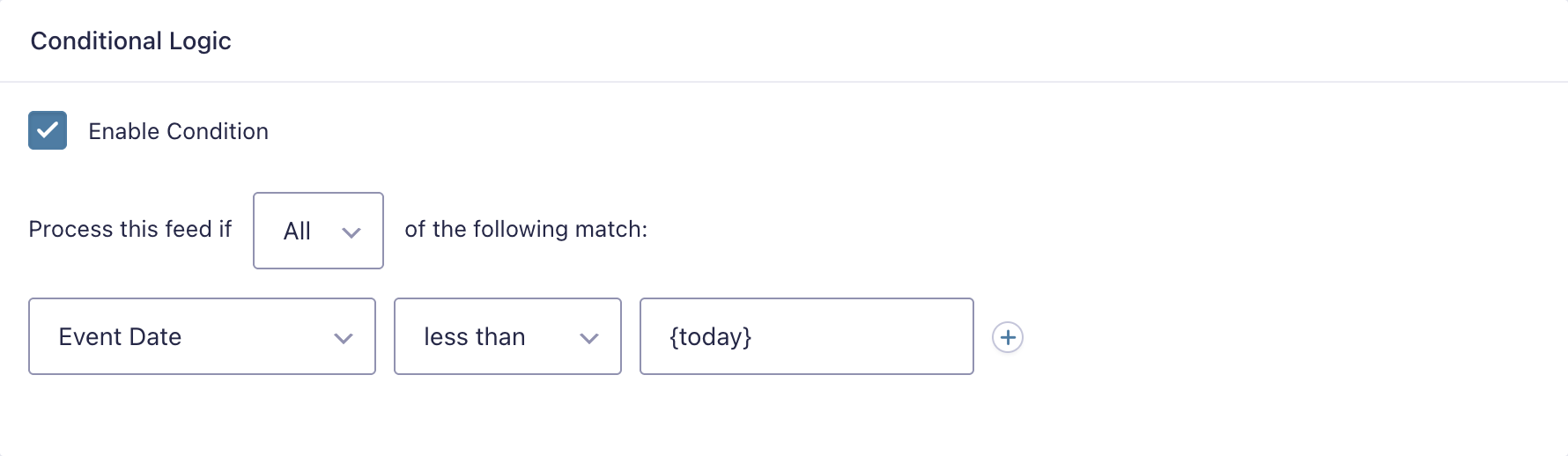 Use date- and time-based conditional logic to control when calendar events are created. Prevent events from being created for past dates, restrict event creation to weekdays only, or require that a date be at least two weeks in the future before an event is added to your calendar. Conditional Logic Dates works directly in the Google Calendar Connection’s feed conditional logic, giving you precise control over which submissions result in calendar events.