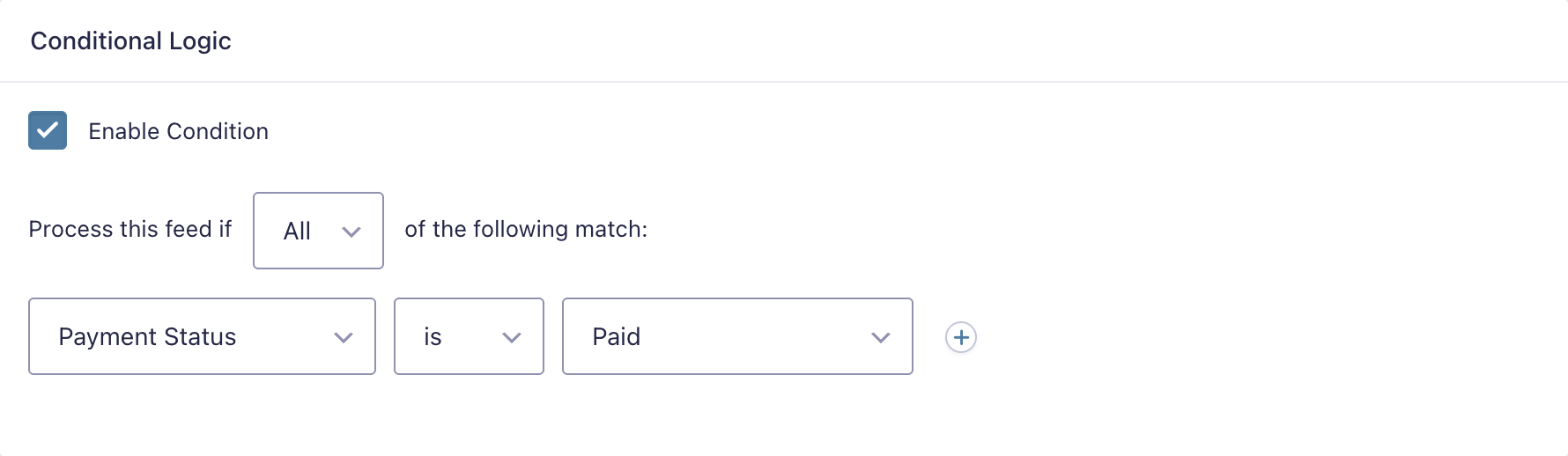 Feeds can be delayed until payment is received. To do so, simply configure the GC Google Calendar feed’s conditional logic to only process if the entry has a desired payment status. Here is an example configuration where the feed is configured to only process if the “Payment Status” is “Paid”.