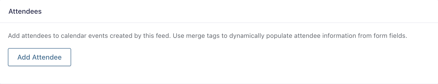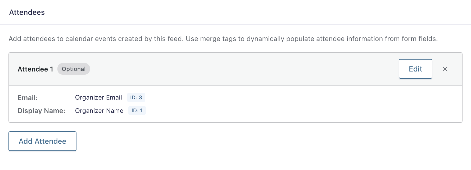 • Email (Required) — The email address of the attendee. Maps to any form field but Email fields are preferred. Specifying a custom value is also supported which may include merge tags.