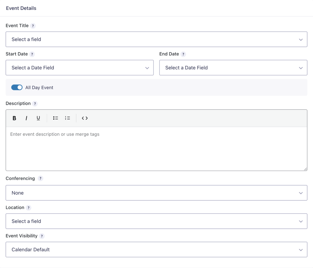 Configure your event details by mapping form fields to event properties like title, dates, times, and description.