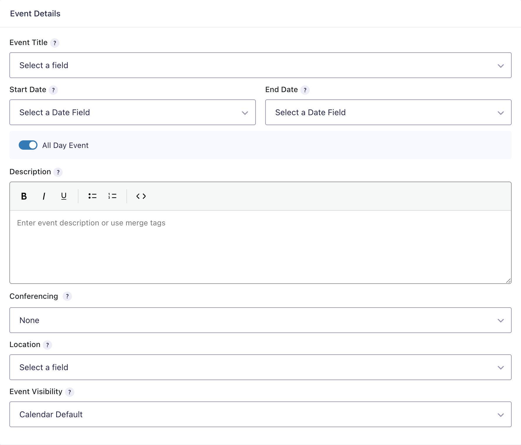 The title that will appear on the calendar event. You can select a form field to use as the event title, or enter a custom value using text and merge tags. For example: Appointment with {Name (First):1.3} {Name (Last):1.6}. If no value is specified, the feed name will be used.