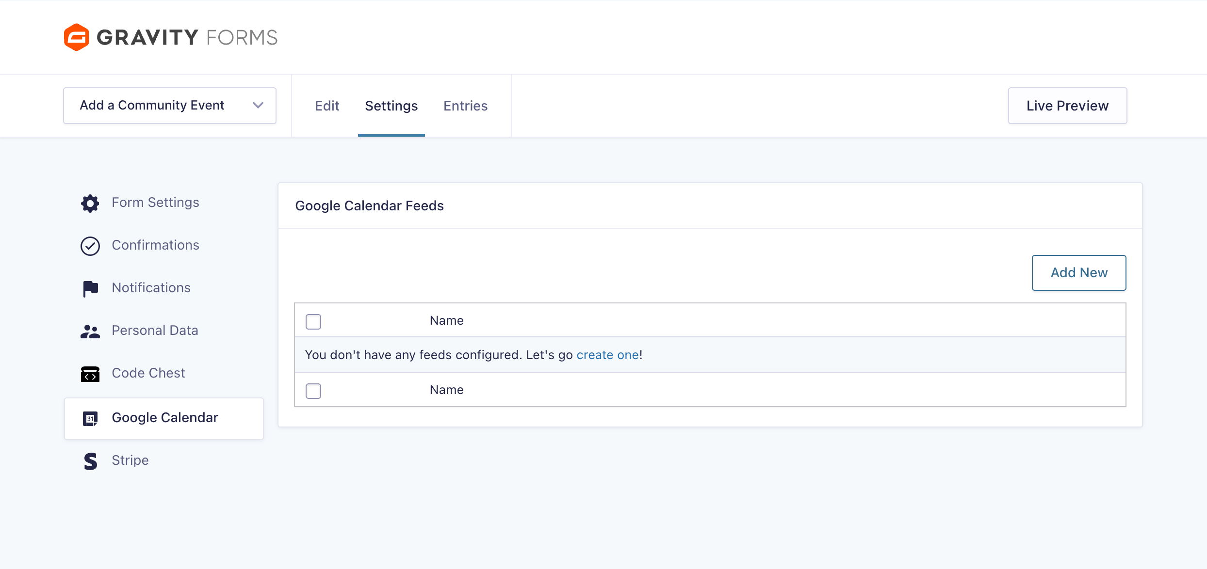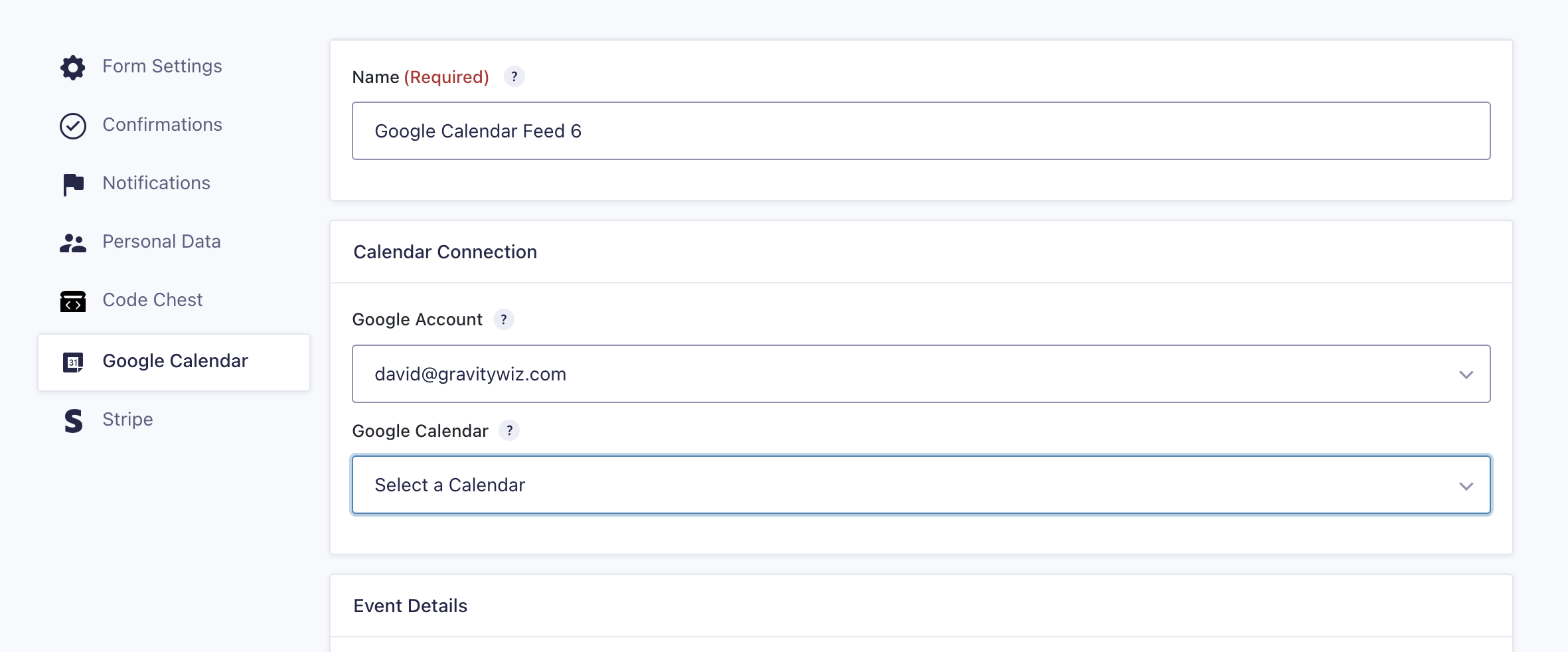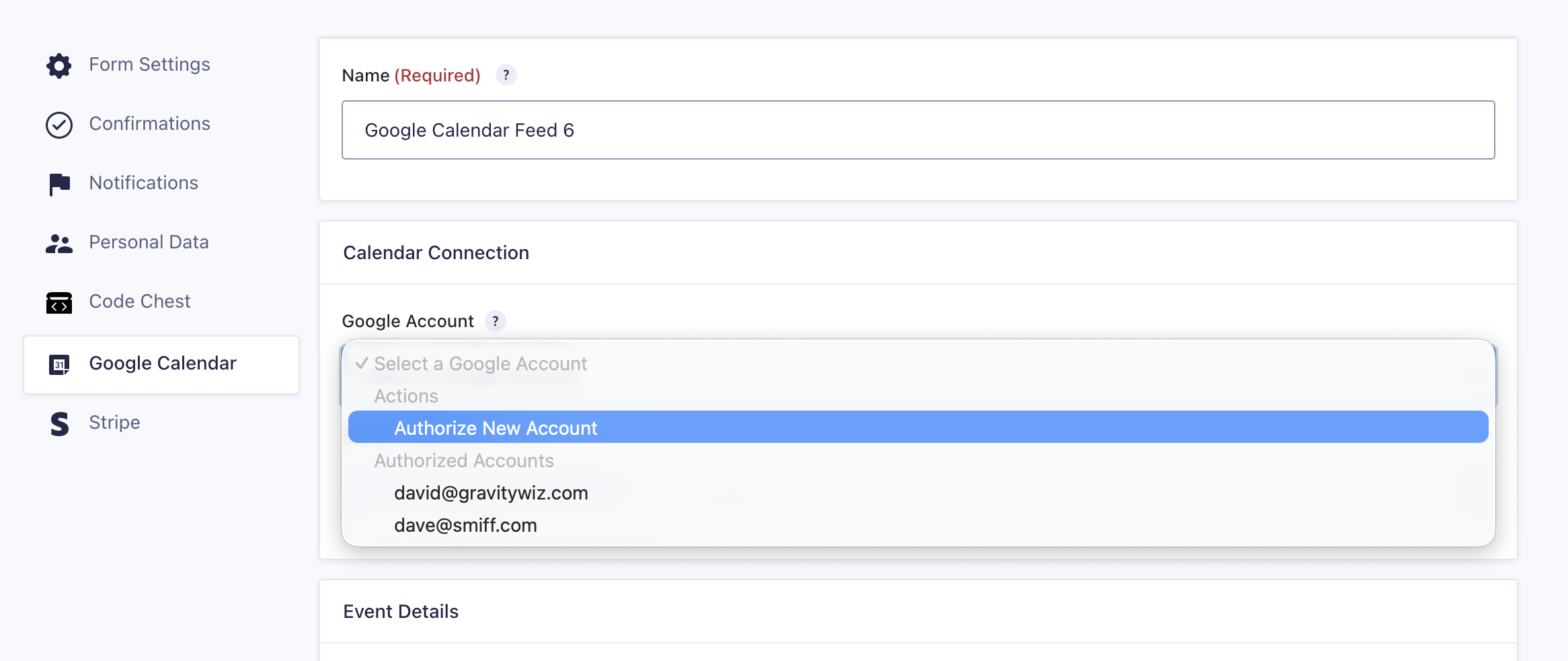 After installing and activating GC Google Calendar, you can create Google Calendar feeds in any form. Use these feeds to create events from your form submissions. You can connect your Google account directly in the feed settings.