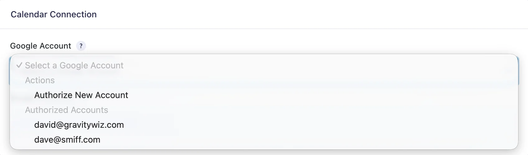 Select the Google account to which your desired calendar belongs. You can authorize a new account by selecting the Authorize New Account option or select a previously authorized account.