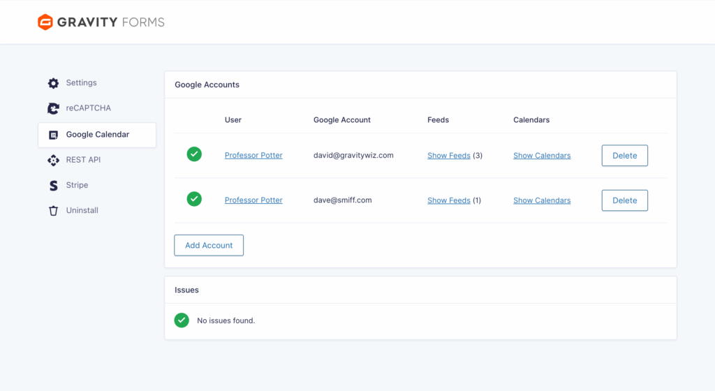 You can manage authorized Google accounts on the plugin settings page. The Google Accounts section provides a list of authorized accounts, including the WordPress user who authorized the account and the feeds and calendars connected via that account.