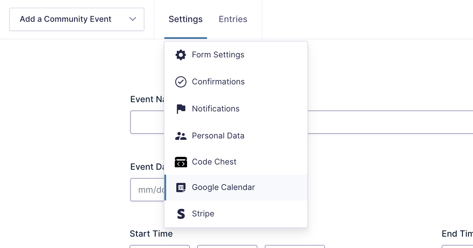 Navigate to your desired form and click the “Google Calendar” item under the “Settings” menu.