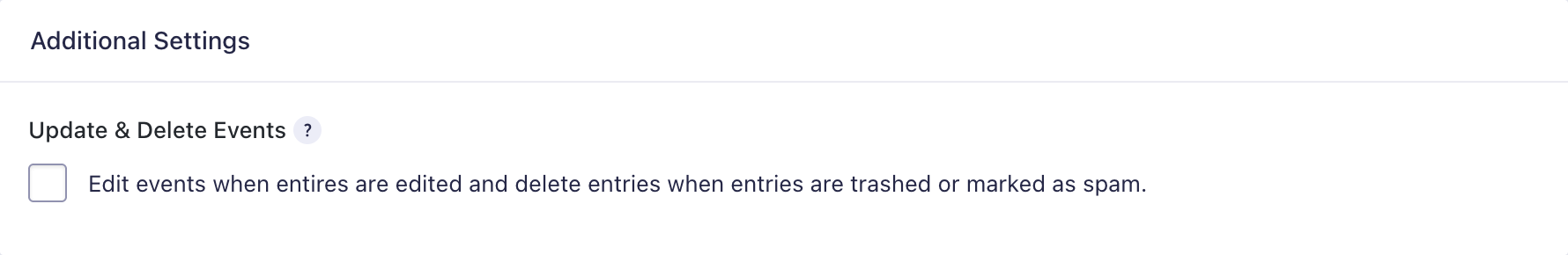 If you would like to keep your Google Calendar events synced to your entry data, enable the Update & Delete Events option. When enabled, events will be edited when entries are edited and deleted when entries are trashed or marked as spam. If an entry is restored from trash or “unspammed”, the event will be reinserted.