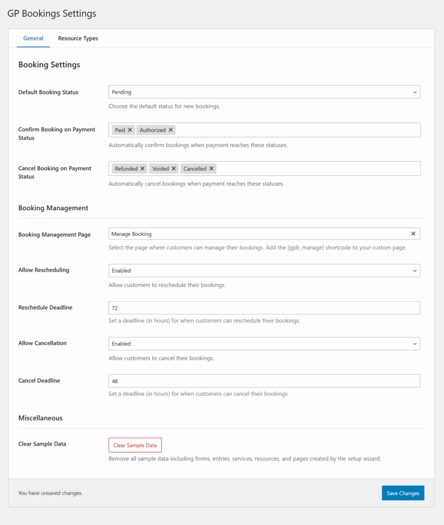 Lastly, in the GP Bookings Settings, you can set up automatic booking behaviors (e.g. mark a booking as Confirmed once payment is processed) and a Booking Management Page to allow users to reschedule/cancel bookings themselves.