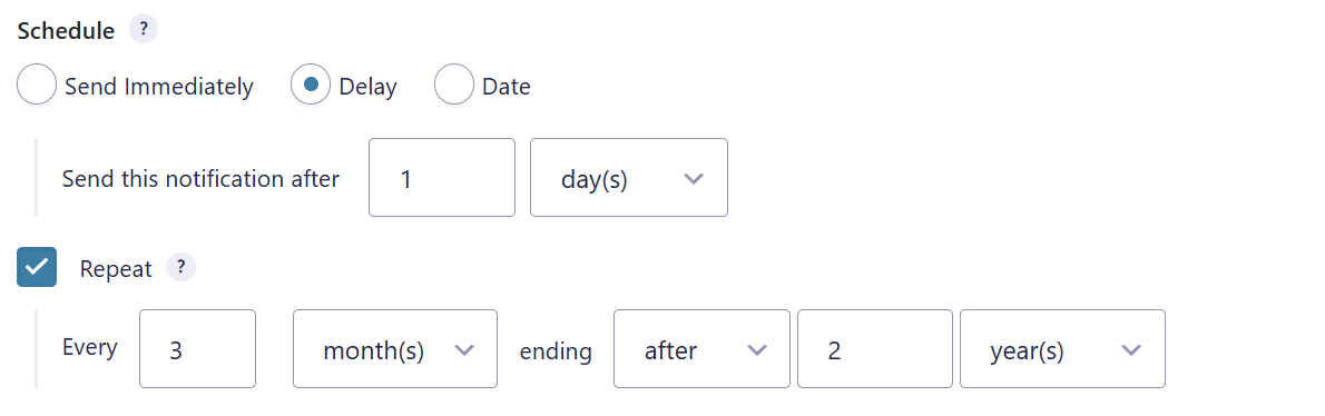 Send notifications minutes, hours, days, weeks, months, and years after a notification event (e.g. a form submission). - Schedule notifications on a specific date.