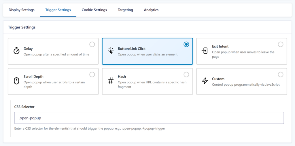 In the CSS Selector setting, you can specify which elements trigger the popup. Enter the CSS selector for the element(s) that should trigger the popup (e.g., .open-popup, #popup-trigger).