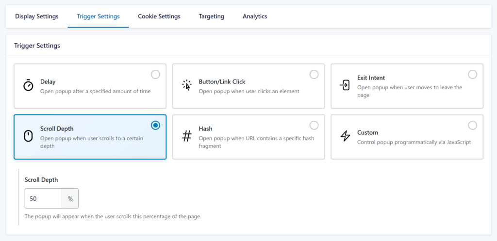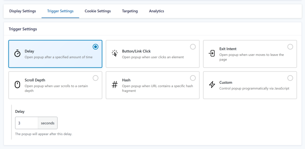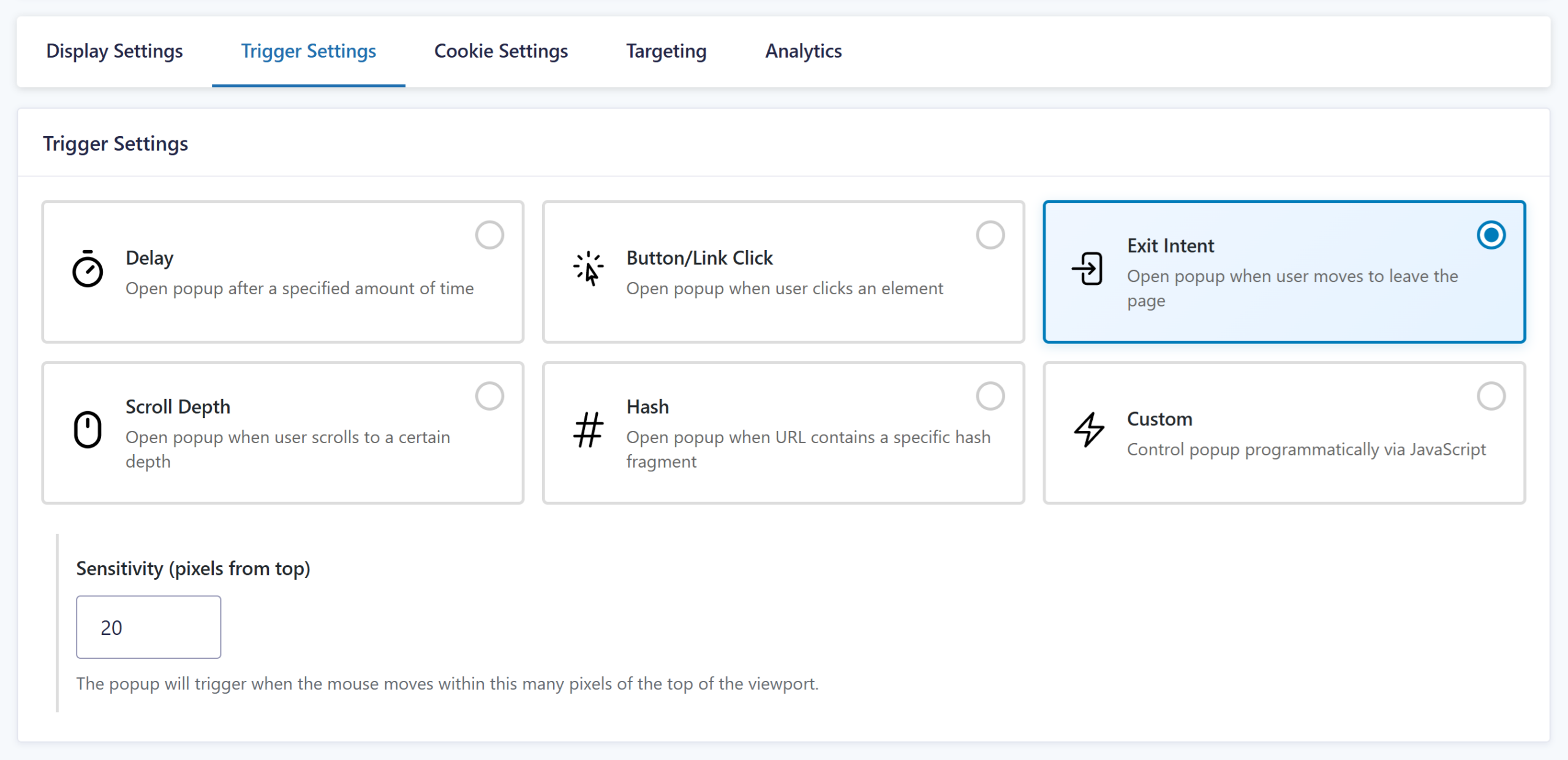 Popups can be triggered based on different user actions or by how long they’ve been on a page. GP Popups offers four built-in ways to do so: