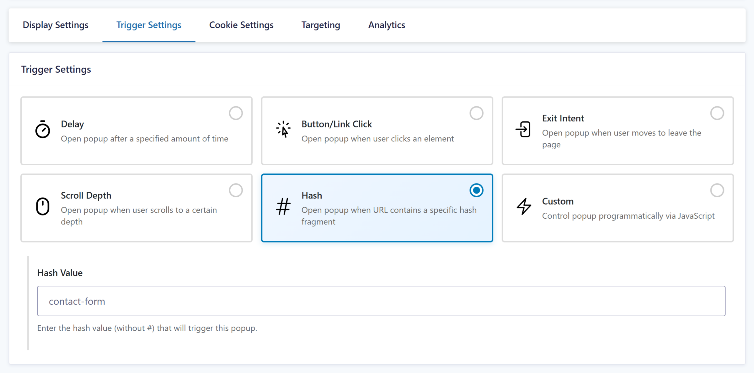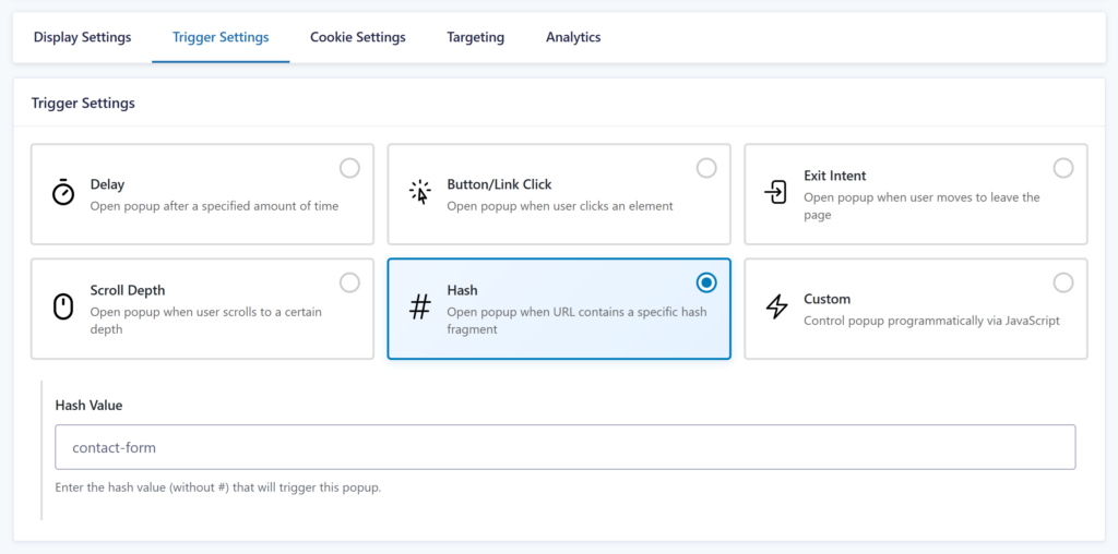 The popup opens when the URL contains a specific hash fragment (like #contact-form). It’s a solid alternative to CSS selectors and makes deep-linking to popups simple and reliable.