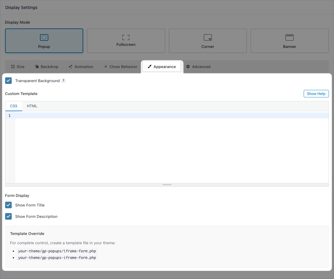 Everything related to the popup’s appearance can be edited in the Display Settings, from where it’s displayed in the page to how it looks. All settings are based on the Display Mode.