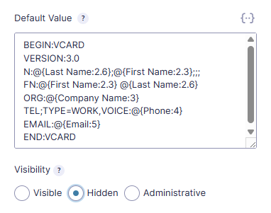 The first step is to add a hidden Paragraph field to the form. Here you can add the vCard format as the default value, and copy the contact details from other fields using Live Merge Tags.