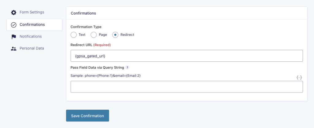 To redirect visitors back to the now un-gated content, you just need to set the gating form’s Confirmation as Redirect and use the {gpsa_gated_url} merge tag as the Redirect URL.