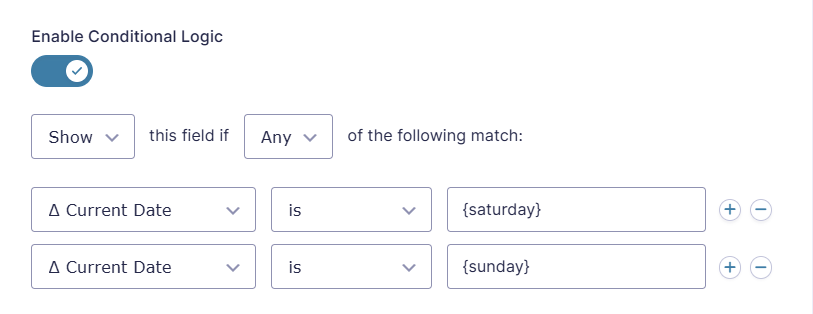 - Conditional Logic Dates – conditionally show/hide fields based on the date, day of the week, time of day, etc.