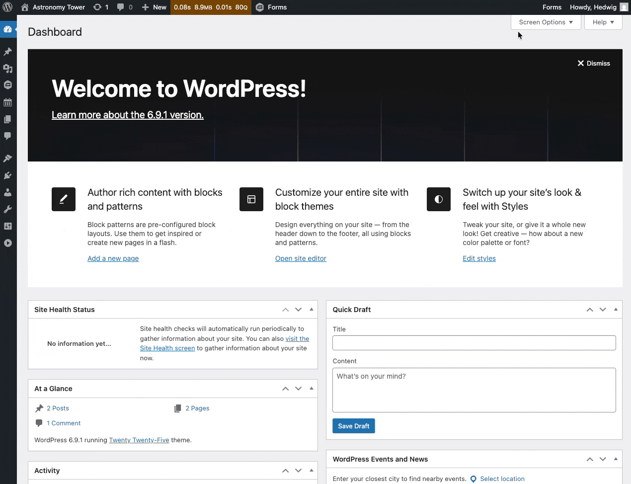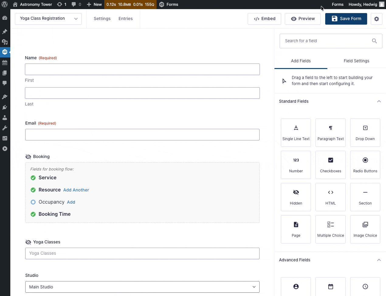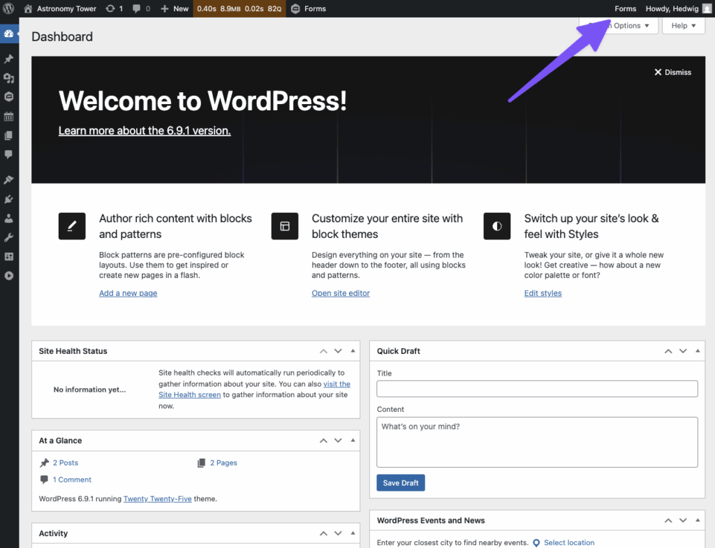 This tool adds a “Forms” item to the top admin toolbar with a handful of form-related shortcuts you can access from anywhere in the WordPress admin.