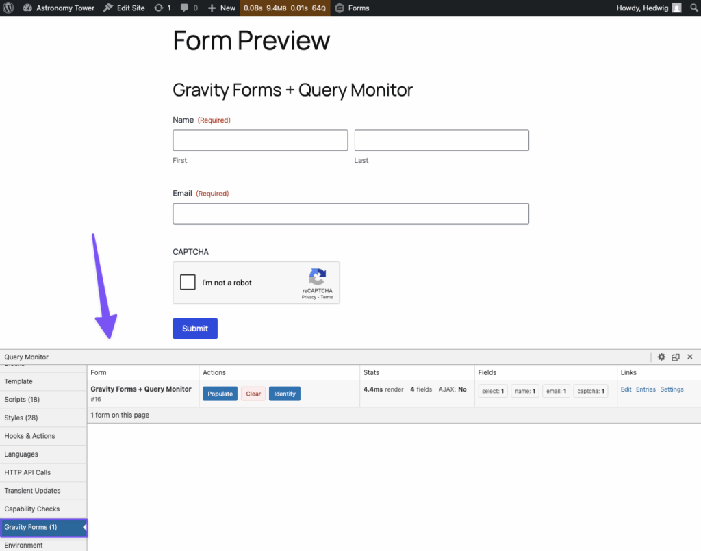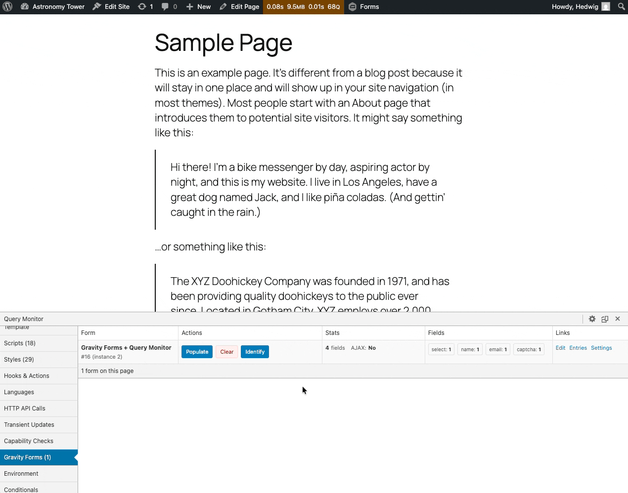 The “Gravity Forms” tab in Query Monitor shows a readout of all forms in a page, listing their name, ID, and fields. It also includes links to the form editor, entries, and form settings.