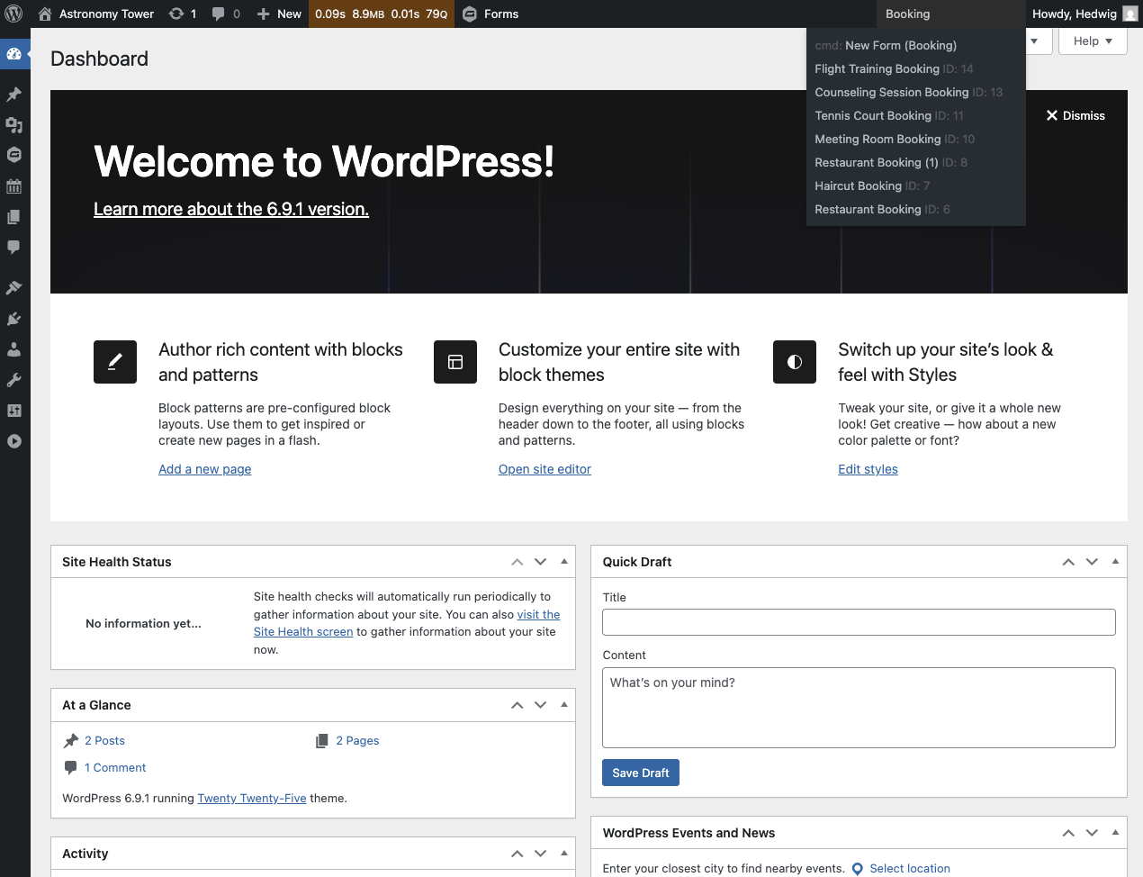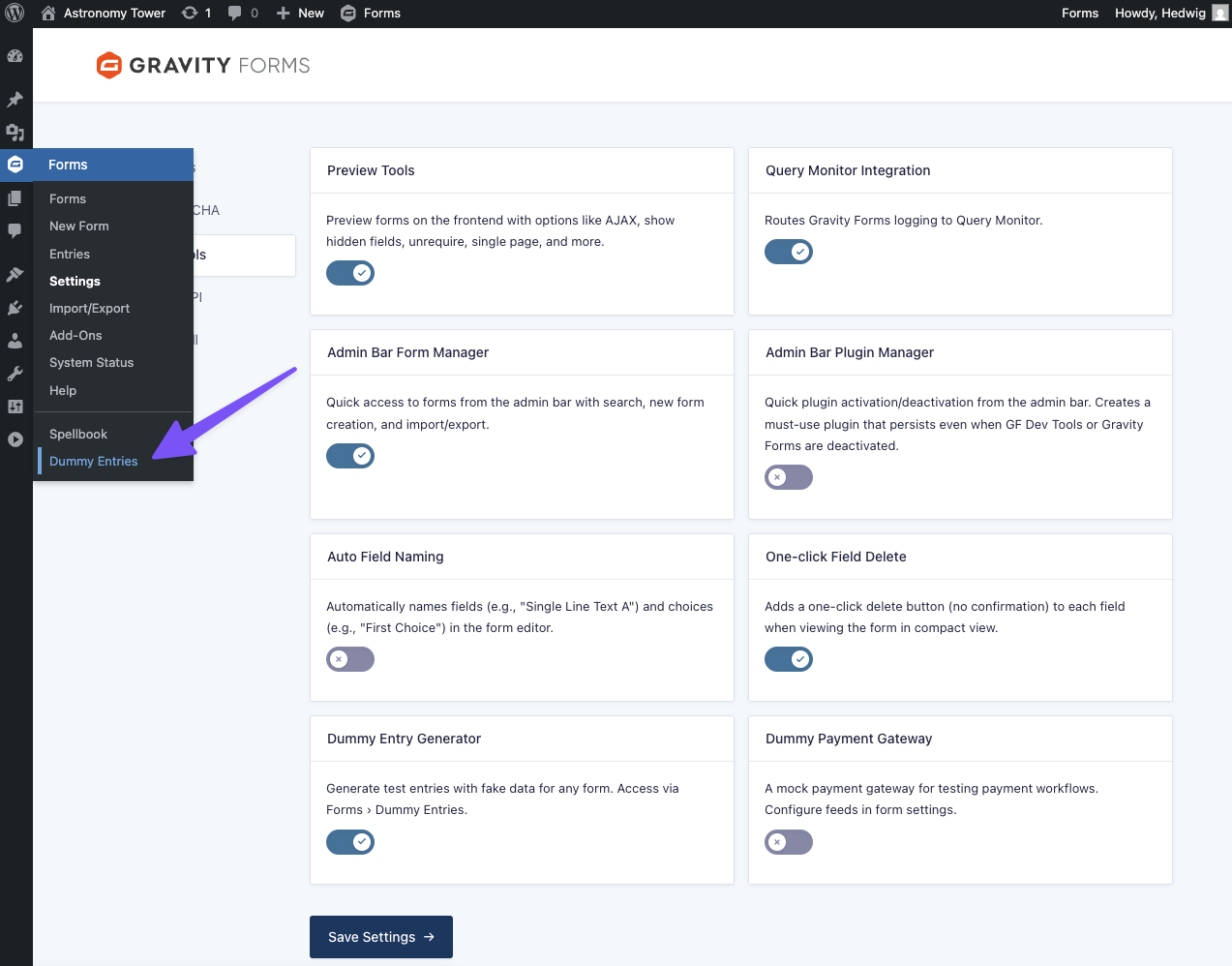 This tool adds a “Forms” item to the top admin toolbar with a handful of form-related shortcuts you can access from anywhere in the WordPress admin.