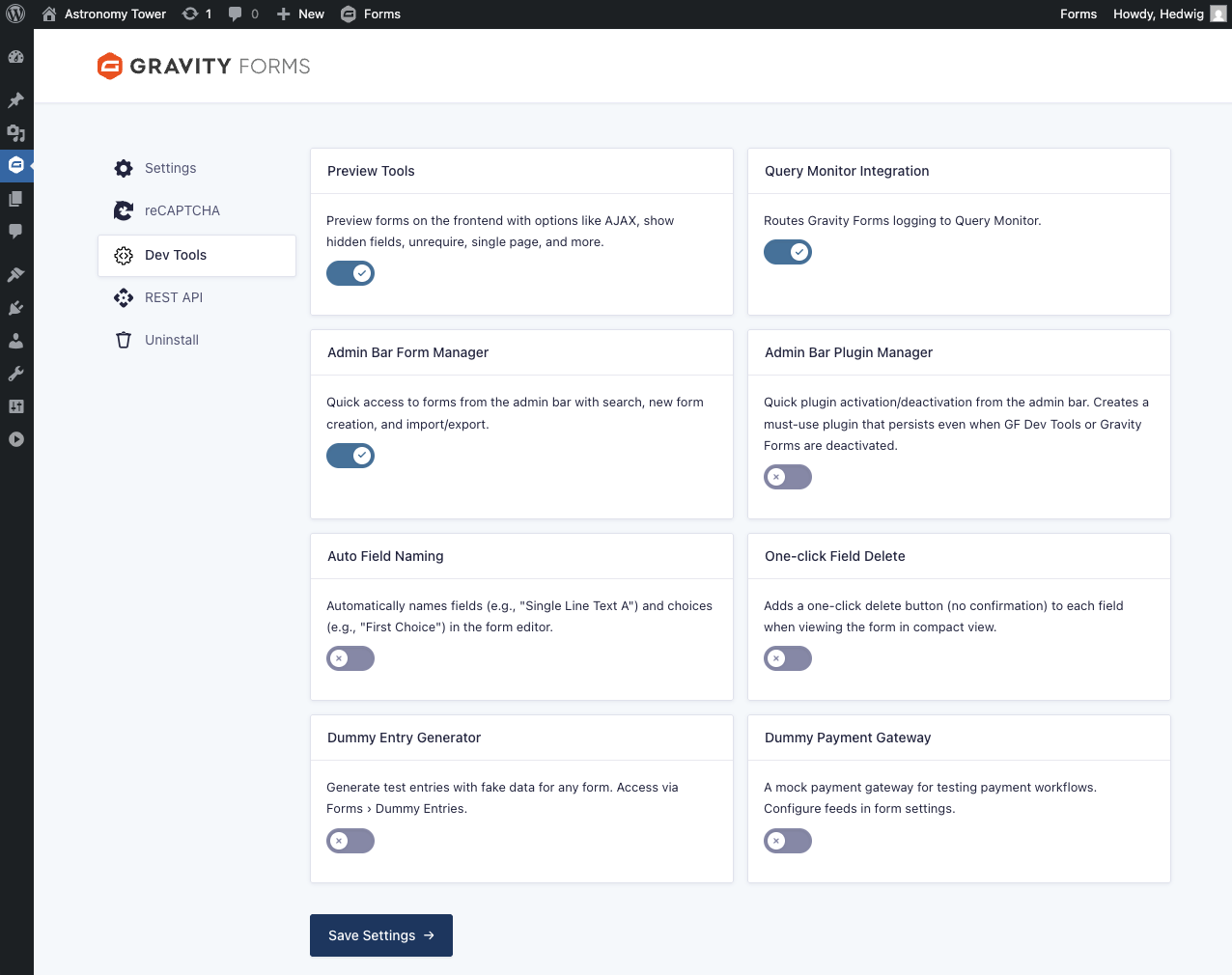 To activate (or deactivate) the tools inside Dev Tools, go to Forms › Settings › Dev Tools.