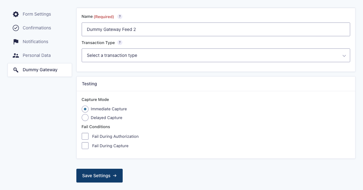 - Immediate Capture: Payment is captured on submission, simulating direct form checkouts. If no Fail Conditions are set, the payment status is marked as
