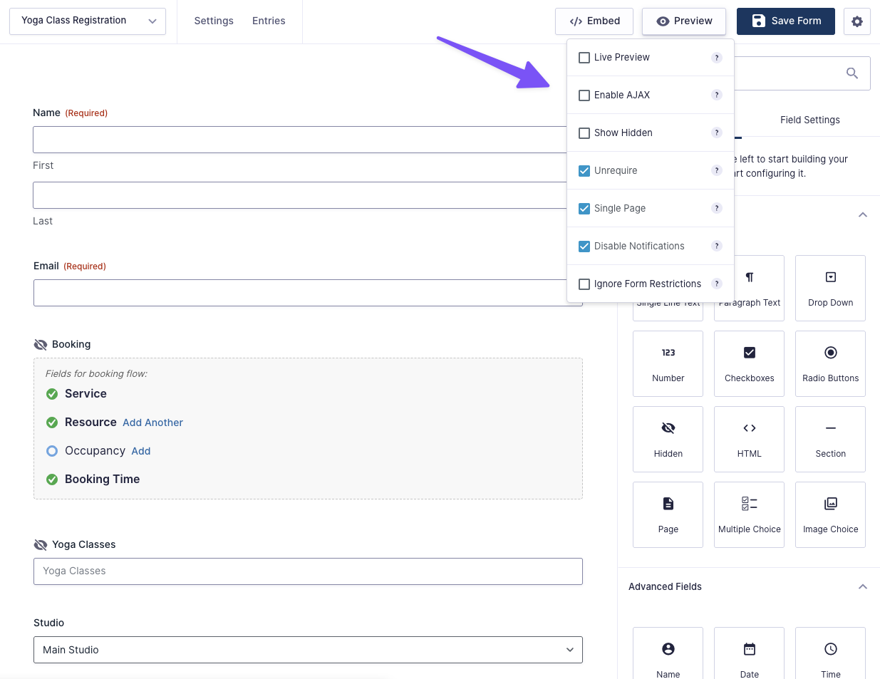 Select Enable AJAX to load your form with AJAX enabled. This is useful for testing how your form is working with AJAX and for quickly disabling it when necessary.