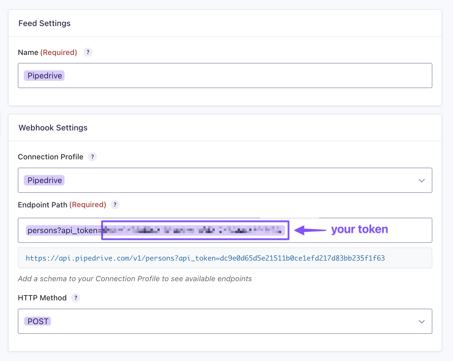 Feed settings showing the API token in the endpoint path.