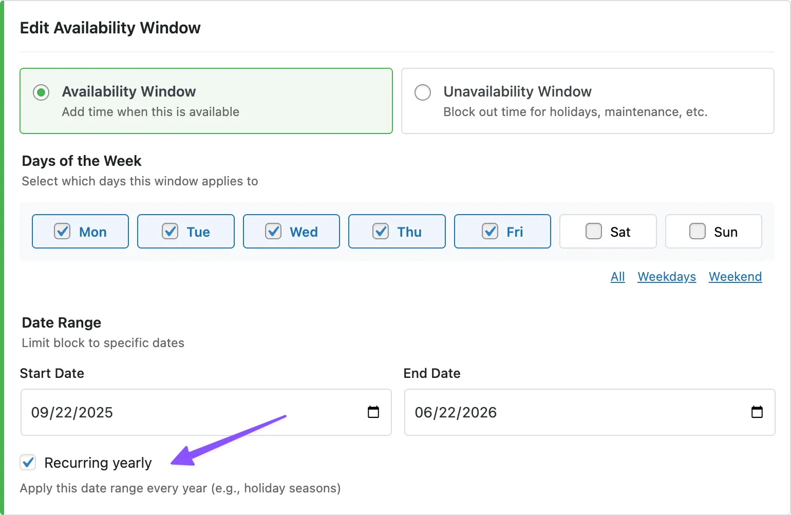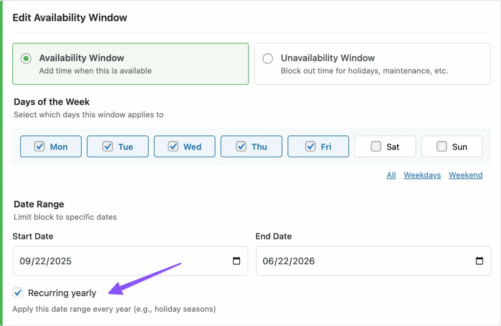 And finally, Availability Windows can now recur yearly. Perfect for holidays and seasonal schedules, this lets you define a date range once and have it automatically apply every year — no more rebuilding availability rules by hand.