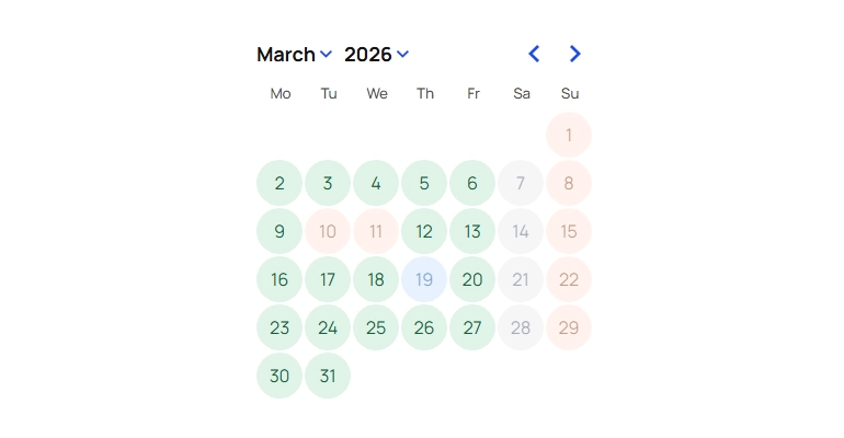 First: We added frontend calendar status CSS classes for booking availability states. This means you can style each calendar date based on whether it’s available, unavailable, outside of any availability window, or already booked.