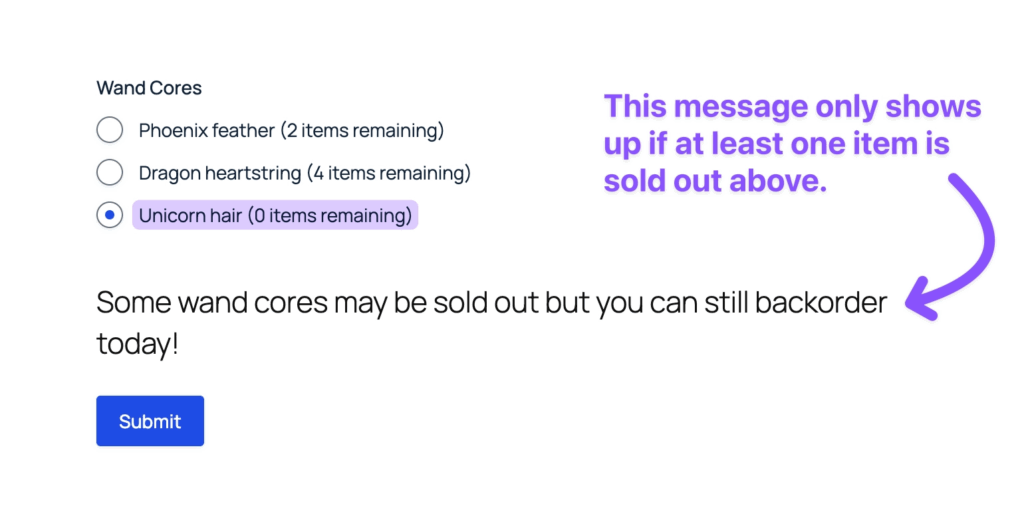 We’ve added “Any Choice Availability” conditional logic option (triggers when any single choice meets condition) and renamed existing to “Overall Availability” (checks selected choice availability). This is useful if you want to show a message if any choice is exhausted (e.g., sold out).