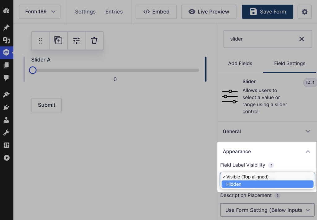 We’ve added the “Field Label Visibility” setting for Slider fields. Just one more dial you can twist to control the display of these slippery fields. 💦