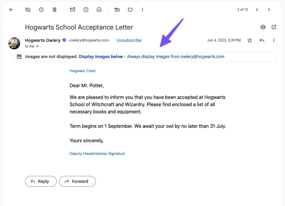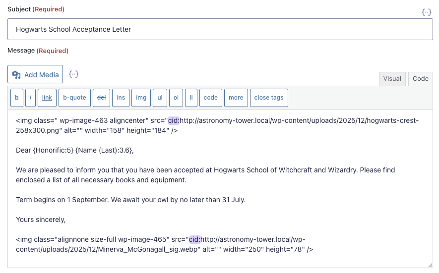 The snippet also supports simple CID identifiers. In the case of our example above, src="cid:2025/12/hogwarts-crest.png" would also work.