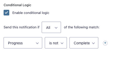 Then, set up conditional logic for the notification based on the Progress not being complete. This stops the notification from being sent in case the user comes back and finishes the form on their own before the allotted time is over.