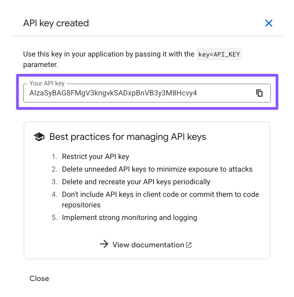 Don’t close this window yet. We’ll need to keep this key safe so only your website can use it.