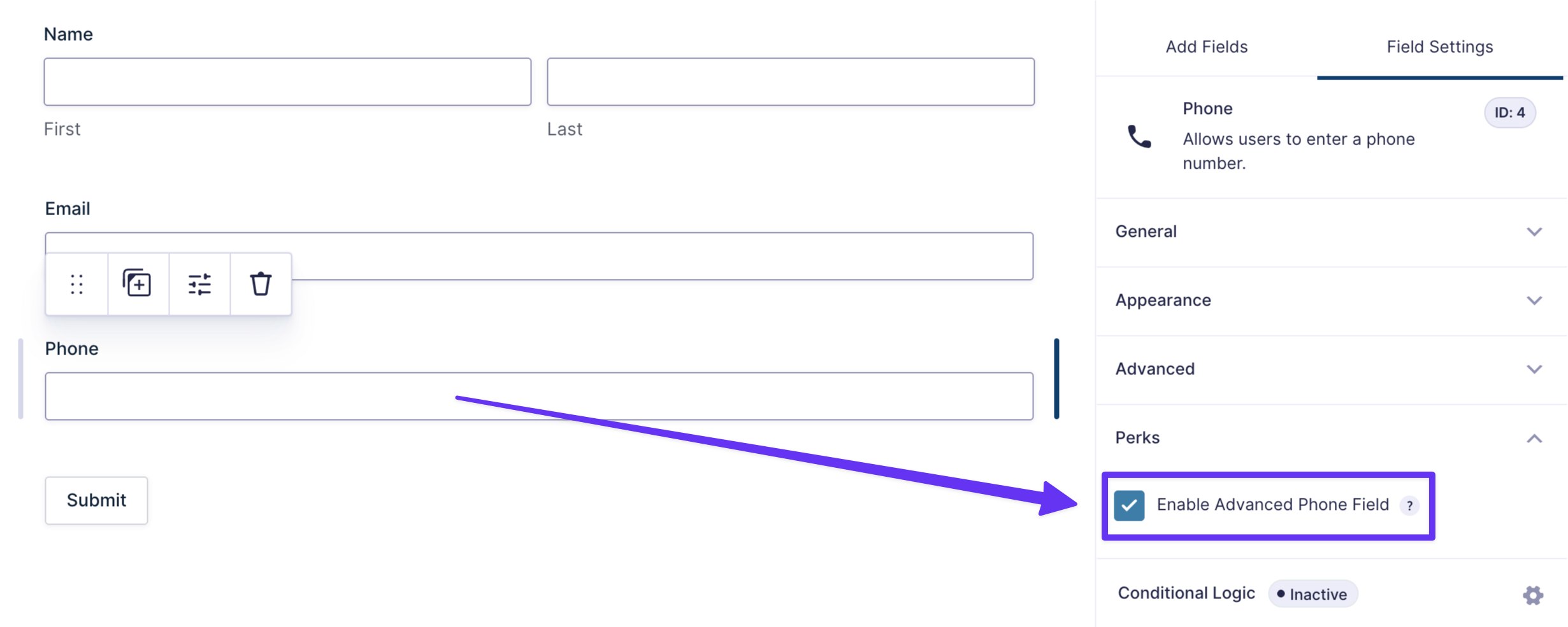 A Phone field is selected, with the settings open on the right. The 'Enable Advanced Phone Field' setting is ticked.