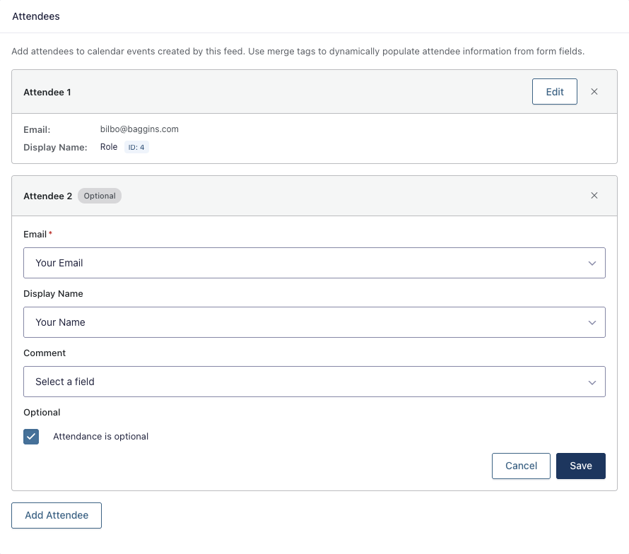 Set event titles, add detailed descriptions, and invite attendees automatically from Gravity Forms. Use merge tags to dynamically populate event details from any form field, unlocking personalized titles like “Meeting with {Name:3.3}” and custom event descriptions.