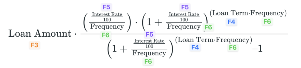 round( F3 * (((F5 / 100) / F6) * (1 + ((F5 / 100) / F6)) ^ (F4 * F6) ) / ( (1 + ((F5 / 100) / F6)) ^ (F4 * F6) -1))