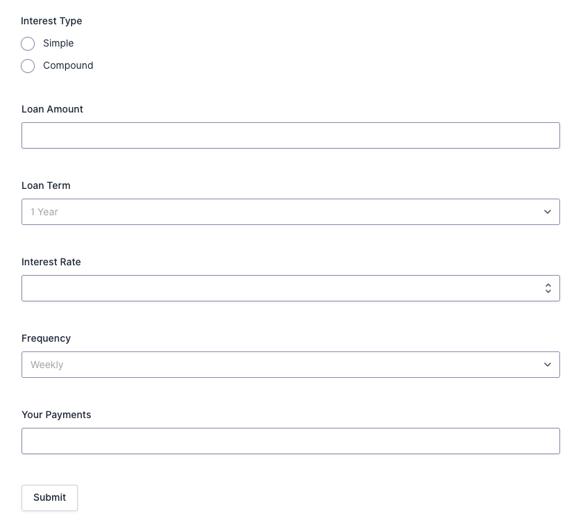 - The calculator in this article is built using a conditional statement and five form fields — interest type, loan amount, loan term, interest rate, and payment frequency.