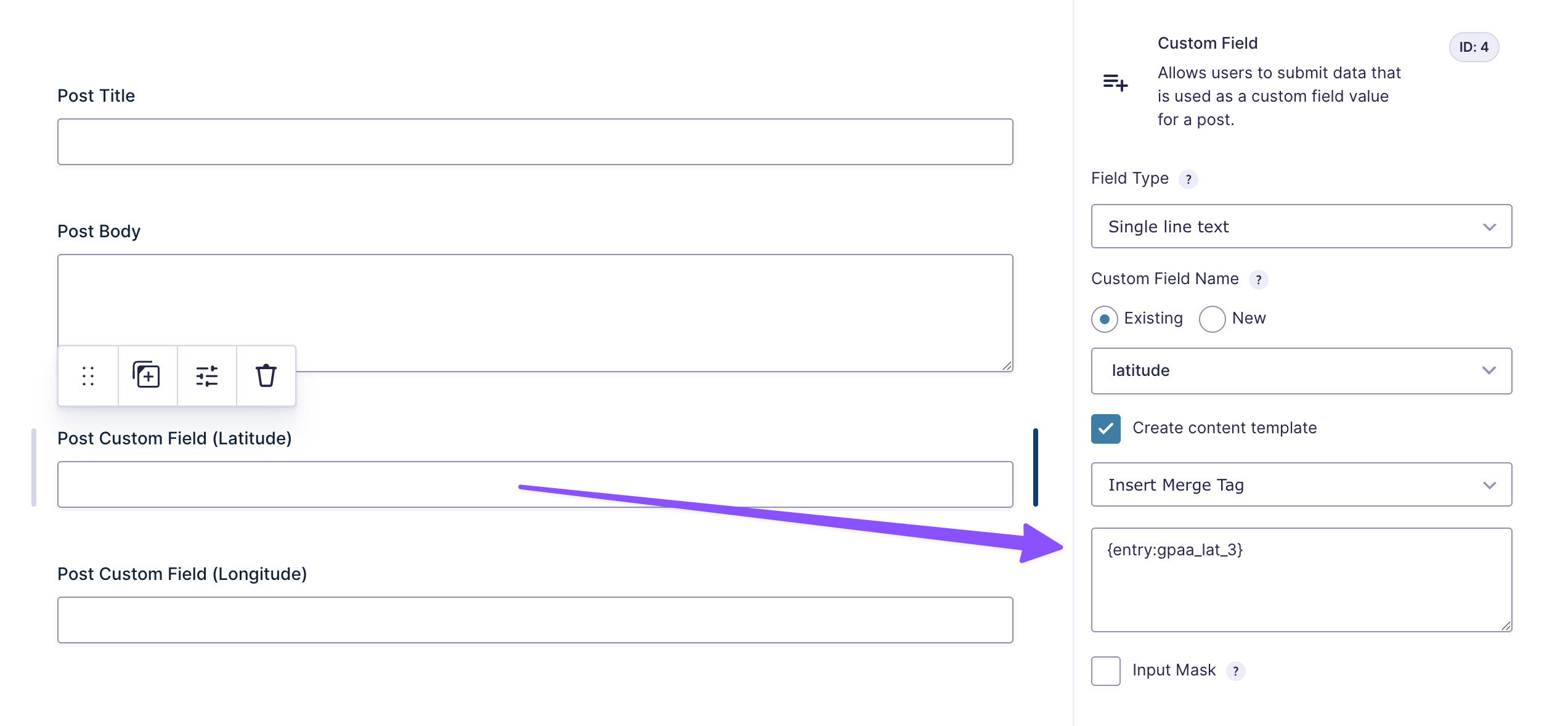 Replace the FIELDID with your Address field’s ID. For example, if your Address field is 3, you’d use entry:gpaa_lat_3.