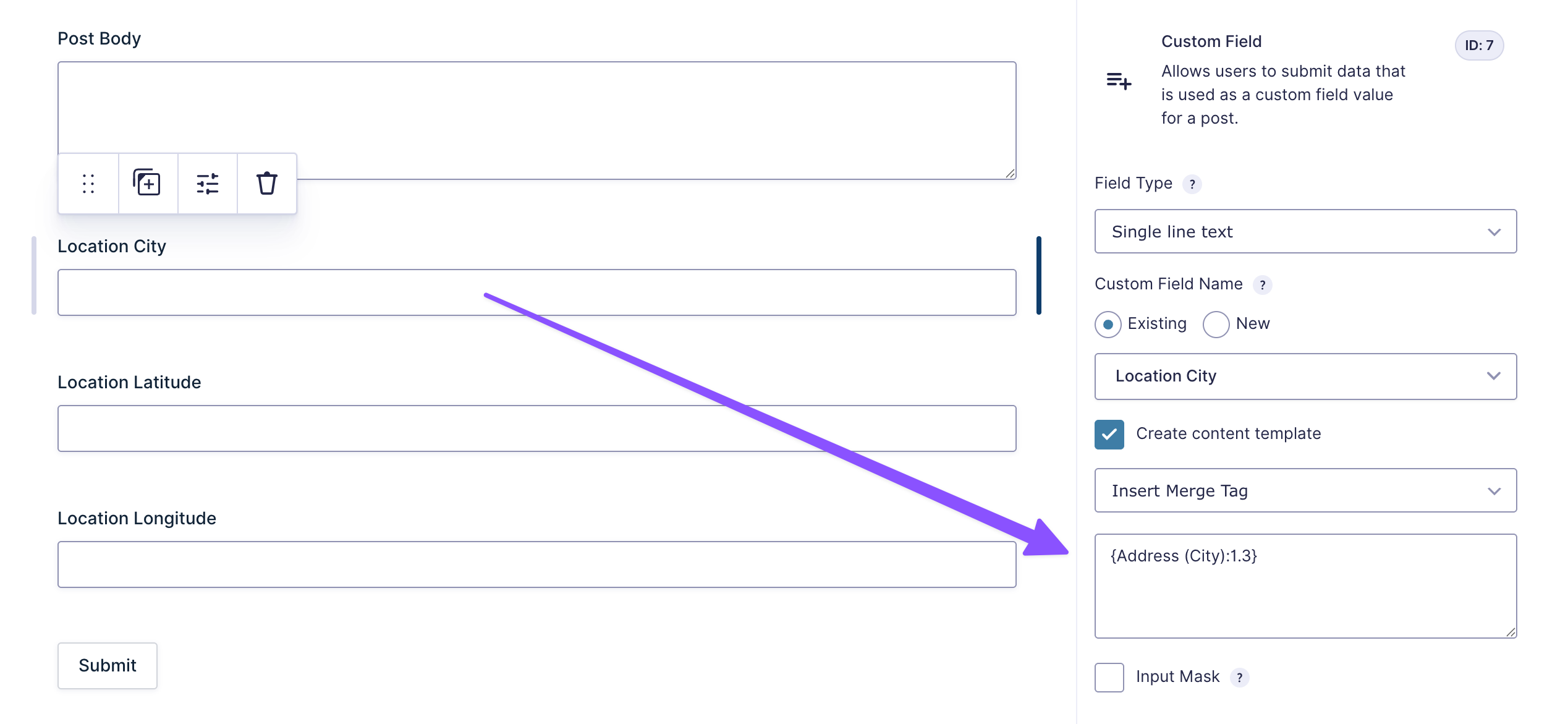 To make this work, add Post Fields (Title and Body) to your form so new posts get created every time someone hits submit. Then, add in a Post Custom Field to map your address meta—which captures data standard Post Fields don’t cover.
