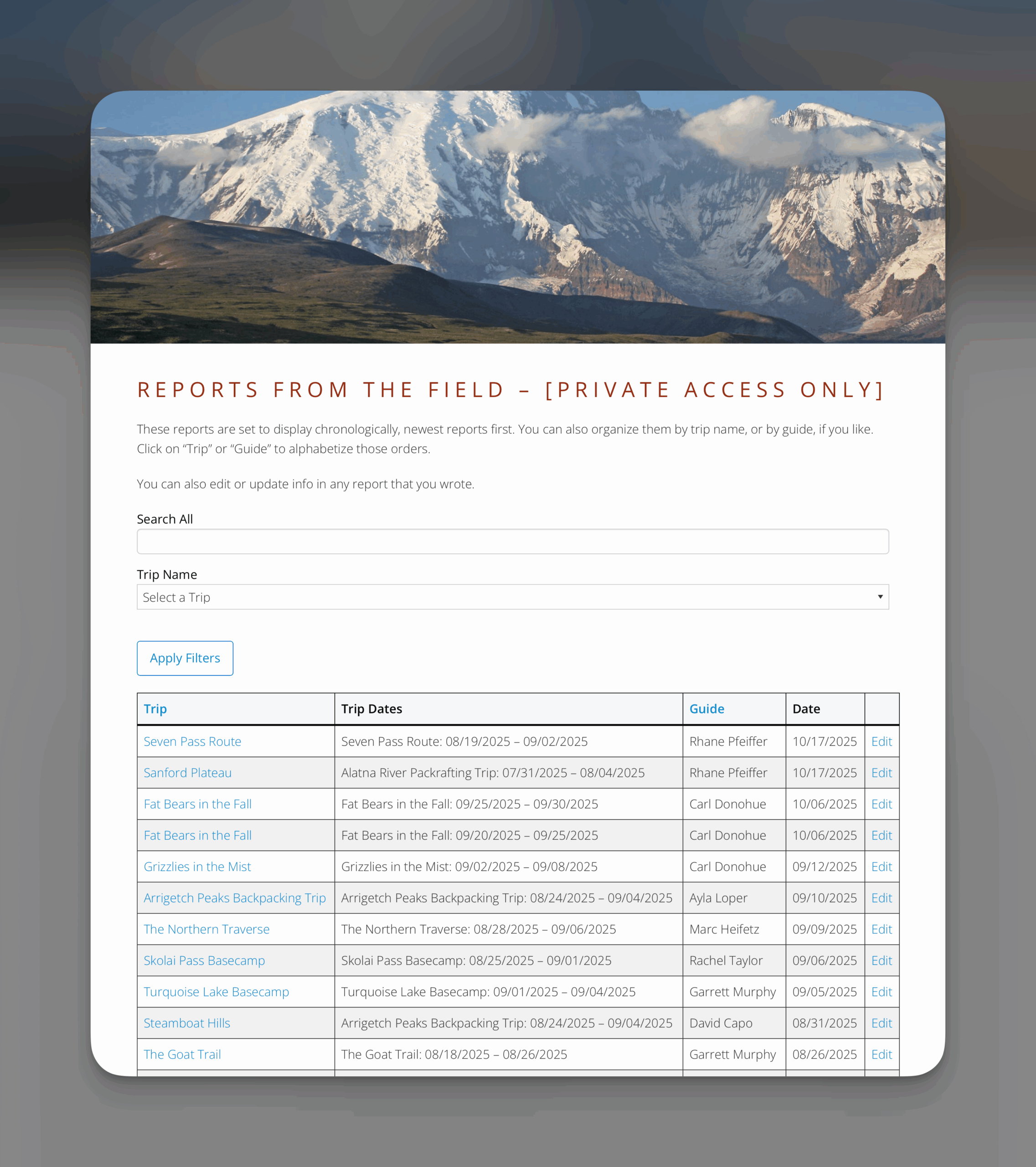 Expeditions Alaska created their own master resource from a routine task. Their reports are automatically displayed in a searchable table interface that educates and motivates guides.