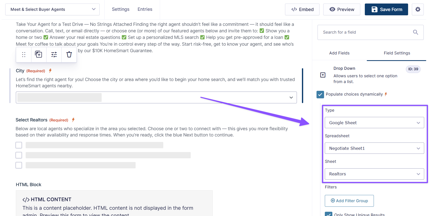 - GP Populate Anything uses that connection to pull the agent data and display it on the live directory, only showing agents from the city the user selected.