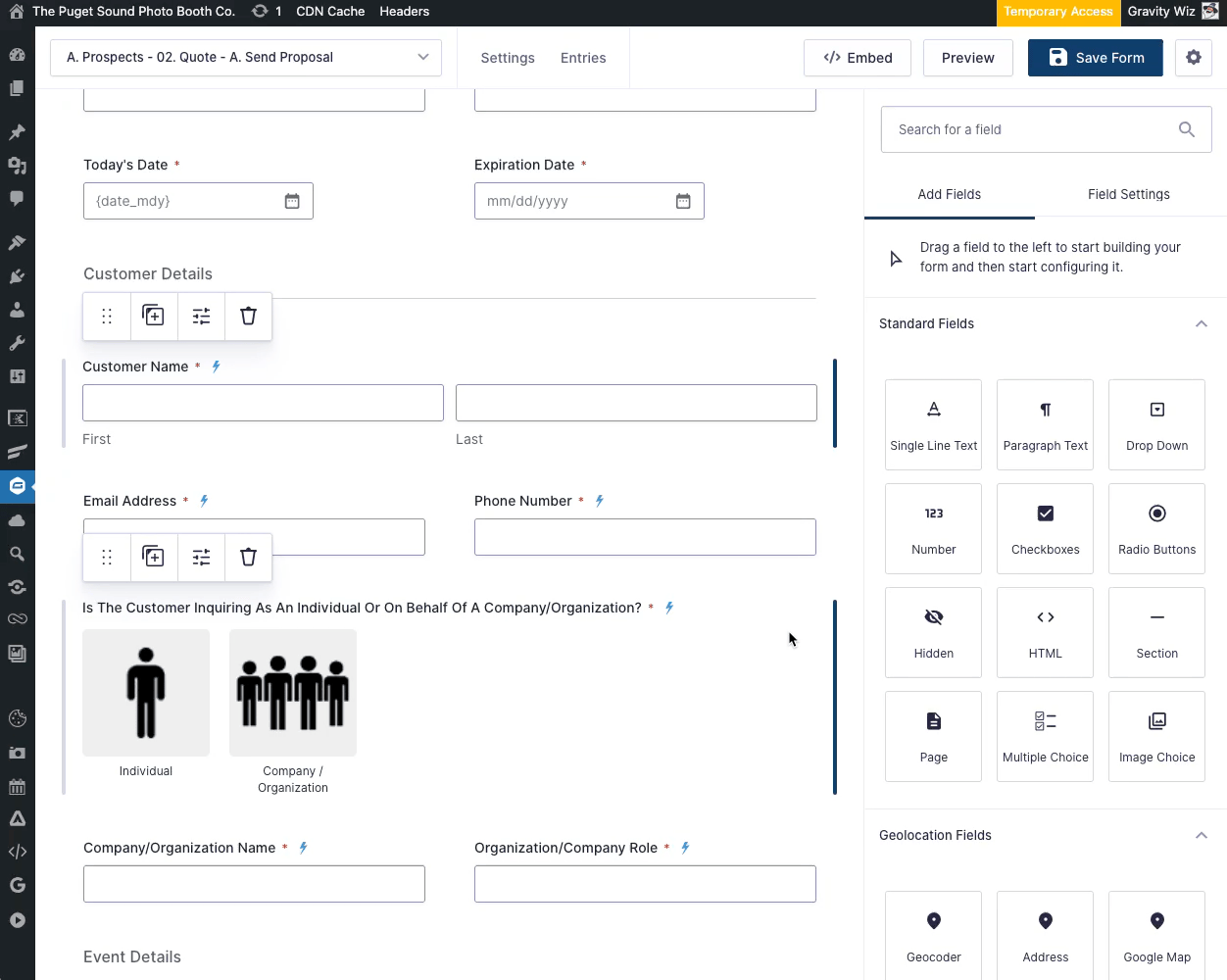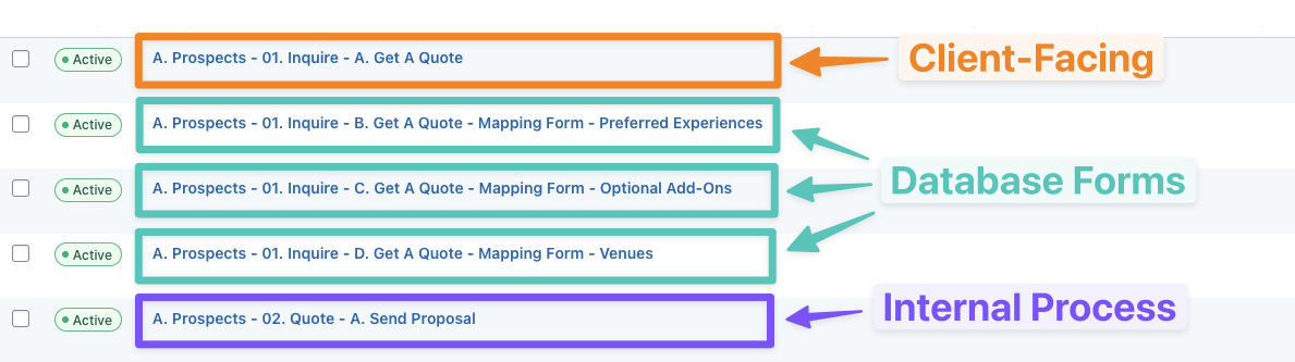 Tony uses many forms that talk to one another for every phase of a client’s lifecycle: from prospects to clients to past clients. These forms cover every bit of the process, including client-facing forms (like “Get A Quote”), internal processes (like “Send Proposal”), and database forms (more on those later).